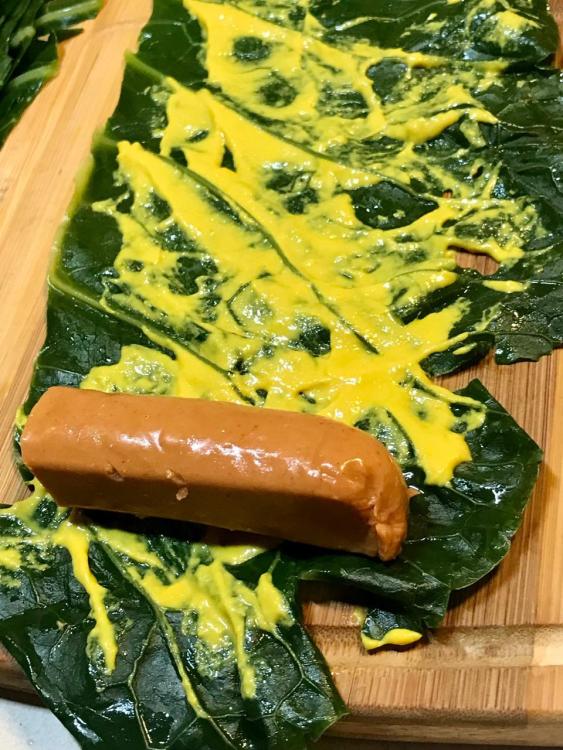 Be sure not to overcook the collards. If you don’t remove that main vein from each leaf in its entirety, you won’t be able to roll the hot dog in the leaf.