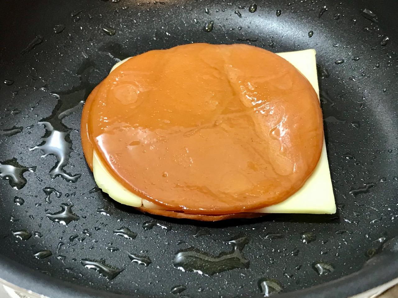 3- Prepared yellow mustard spread on second toast topped with heated Follow Your Heart Smoked Gouda slice between 2 slices Tofurky bologna till cheese melts in small skillet.