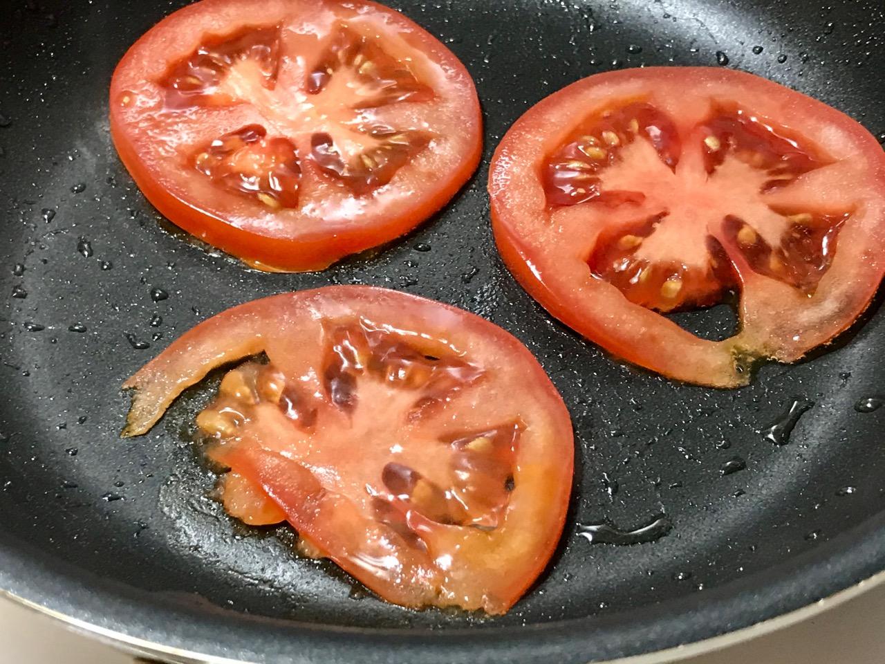 2- Plant mayo on one toast topped with pan-fried sliced tomato and fresh grind black pepper.