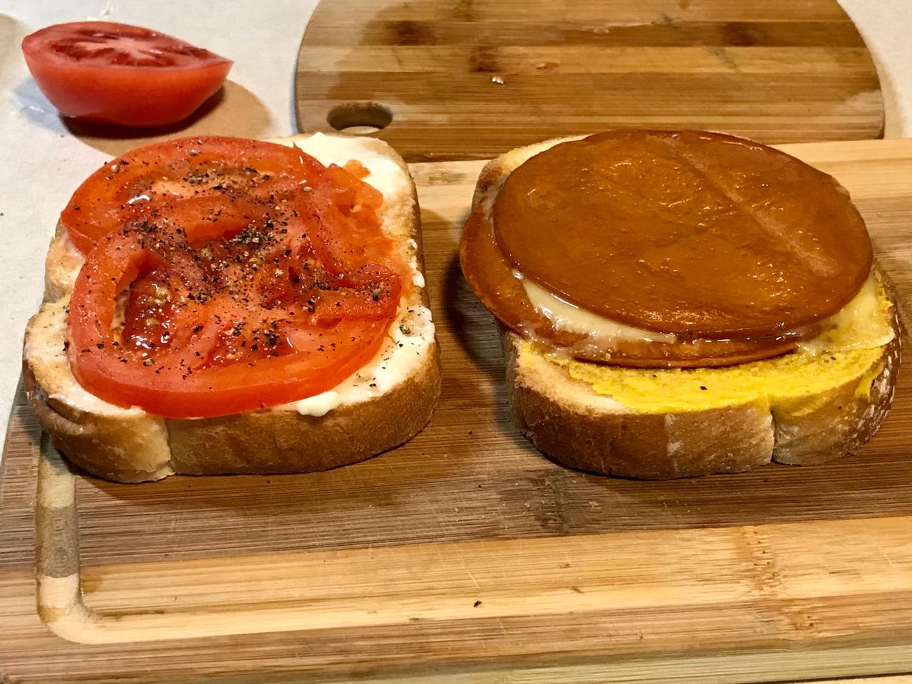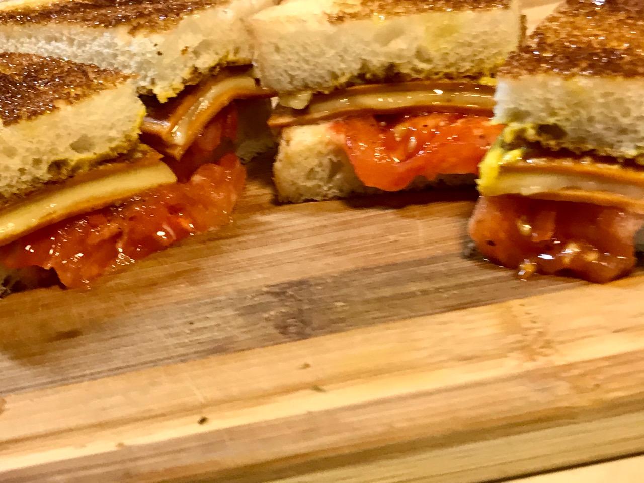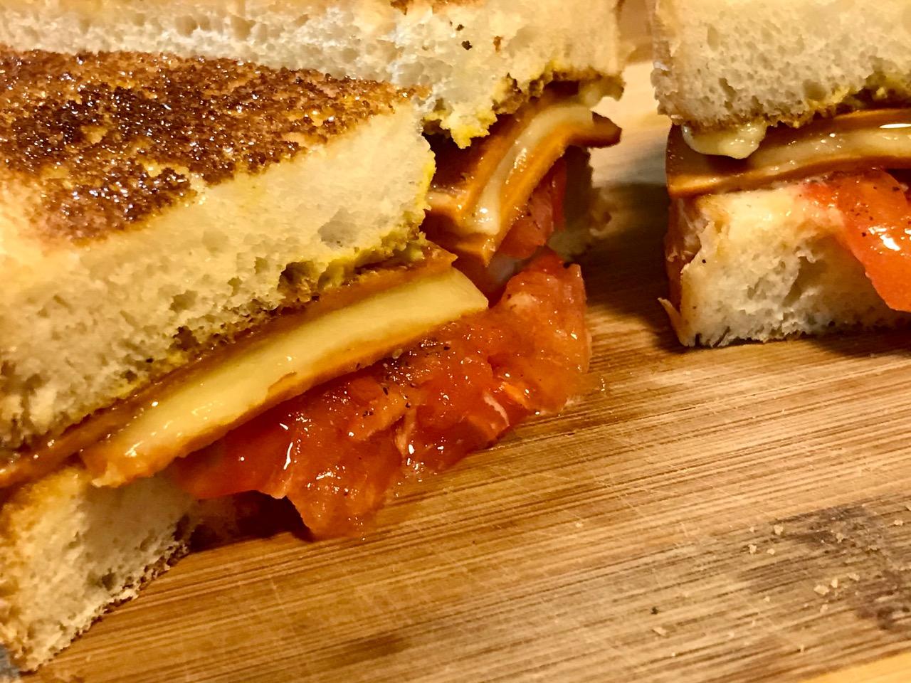 Now you can toast the bread in the toaster, pan-fry the cheese between two pieces of Tofurky bologna in just a little oil, then pan-fry tomato slices till warm, not mush.
