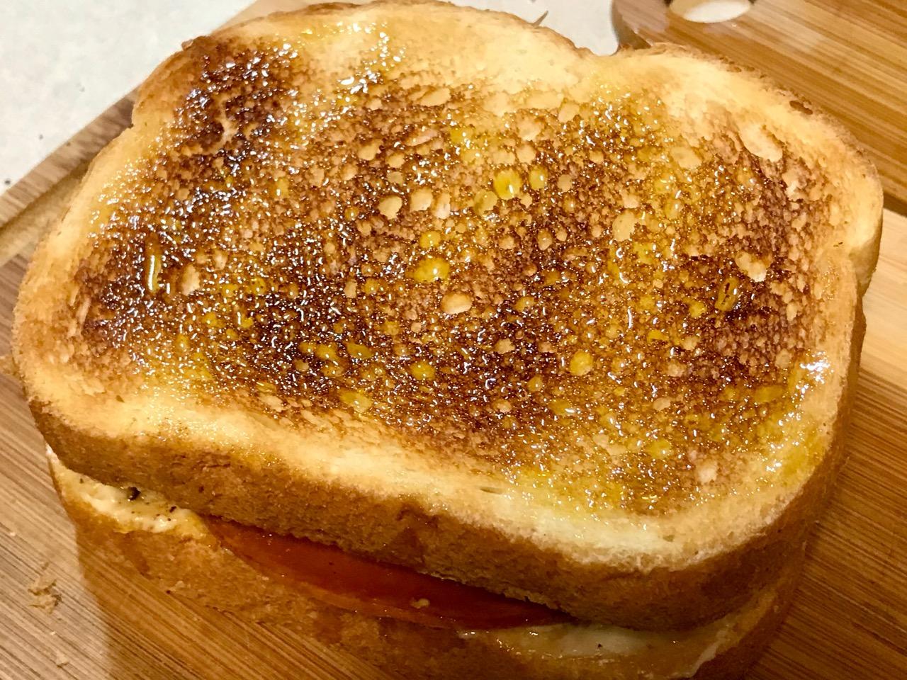 It wasn’t. I toasted the bread in the toaster, then heated the cheese and the bologna in the skillet. Did you know that?