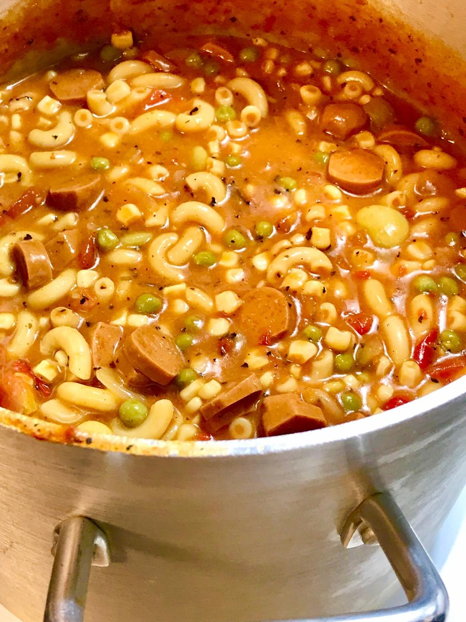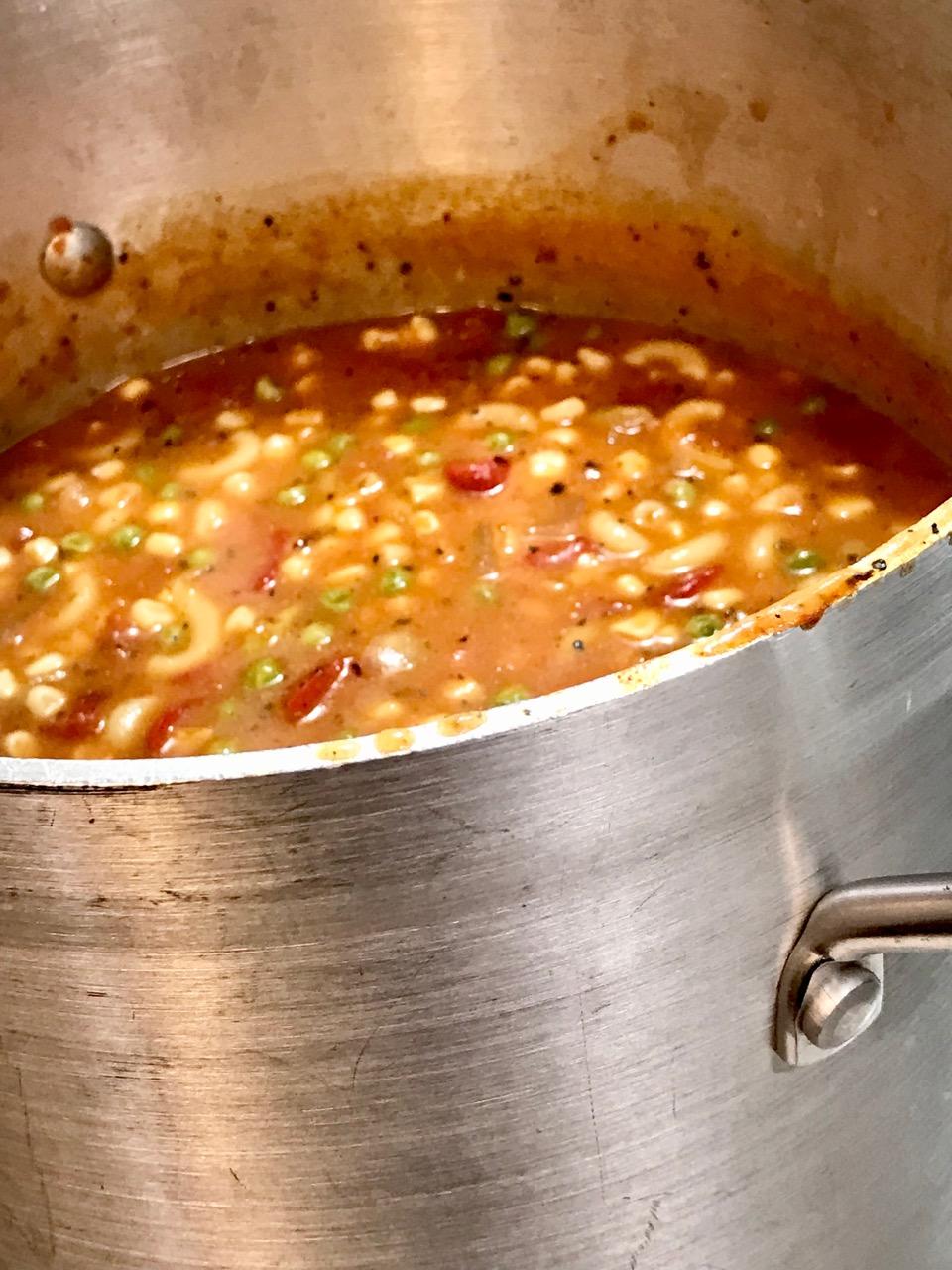 Notes: Usually I cook the macaroni separately and add it to the soup after it’s drained and after the soup has been assembled and cooked. This time I decided to measure the water needed to cook one pound of macaroni, knowing all along that I was going to keep the water. It’s just easier, and I don’t have to deal with draining a big pot of boiling water into the colander in the sink. It worked out beautifully.
