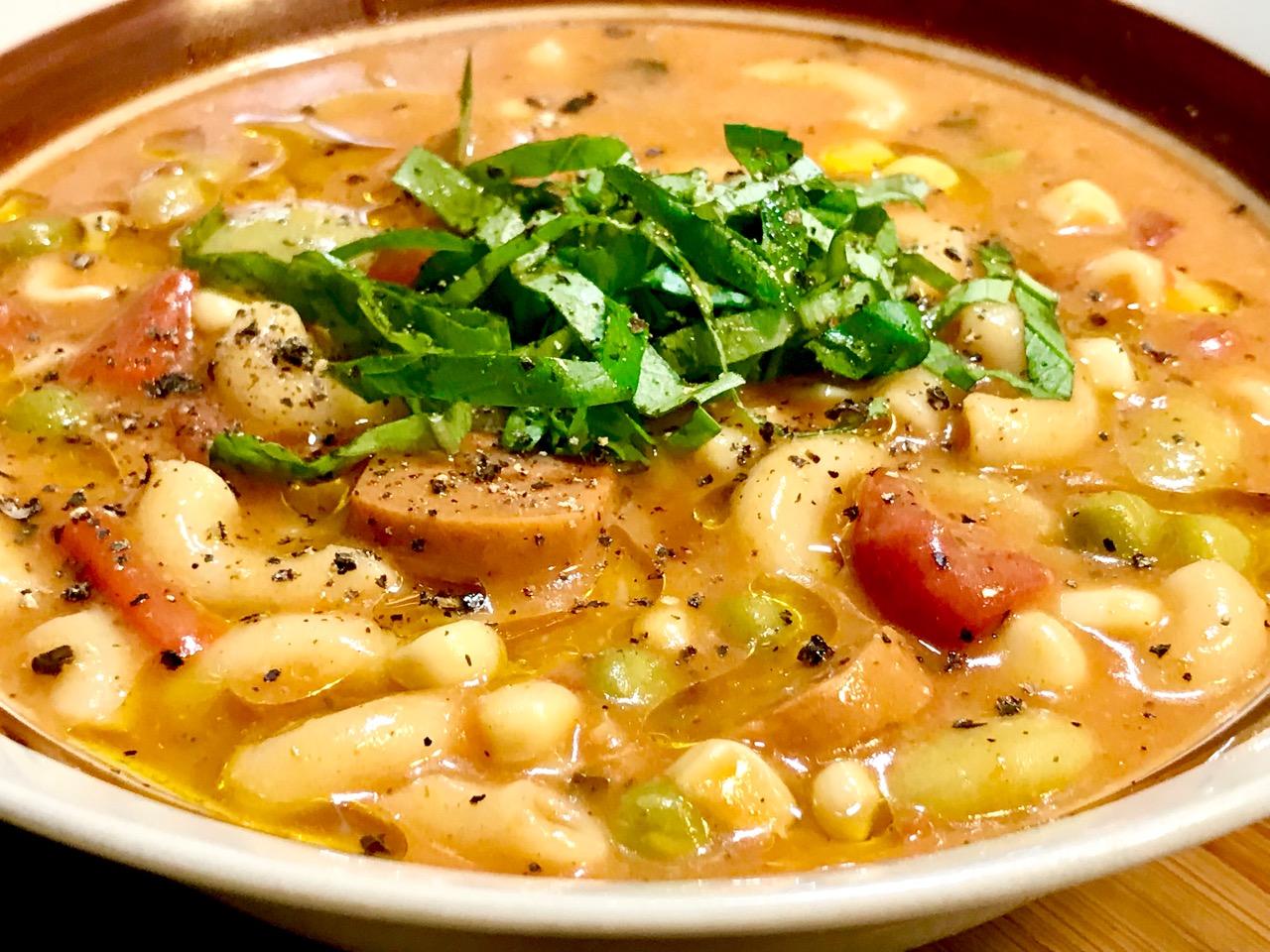 Yes, chowder made with macaroni instead of potatoes, and tomatoes too. White corn, peas, lima beans, roasted tomato and sweet red roasted pepper. Garlic, thyme, smoked paprika, liquid smoke – fresh basil too! Chowder it with FORAGER CASHEWMILK YOGURT and extra virgin olive oil! A Treat to be sure as is, but I went a bit further and added sliced veggie hot dogs.