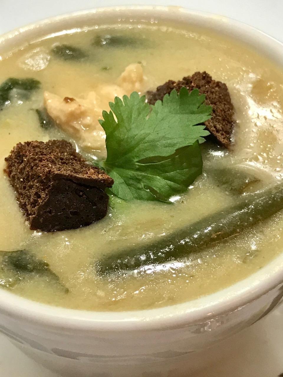 Delight Soy chicken nuggets transform into plump pieces of delight when cooked in this velvety rich faux chicken soup. Chicken never tasted so good! Made with a rice base called RICE CREAM adds of onion cooked till sweet, fresh green beans and fresh cilantro. A little fresh grind black pepper seals this deal forever GOAT.