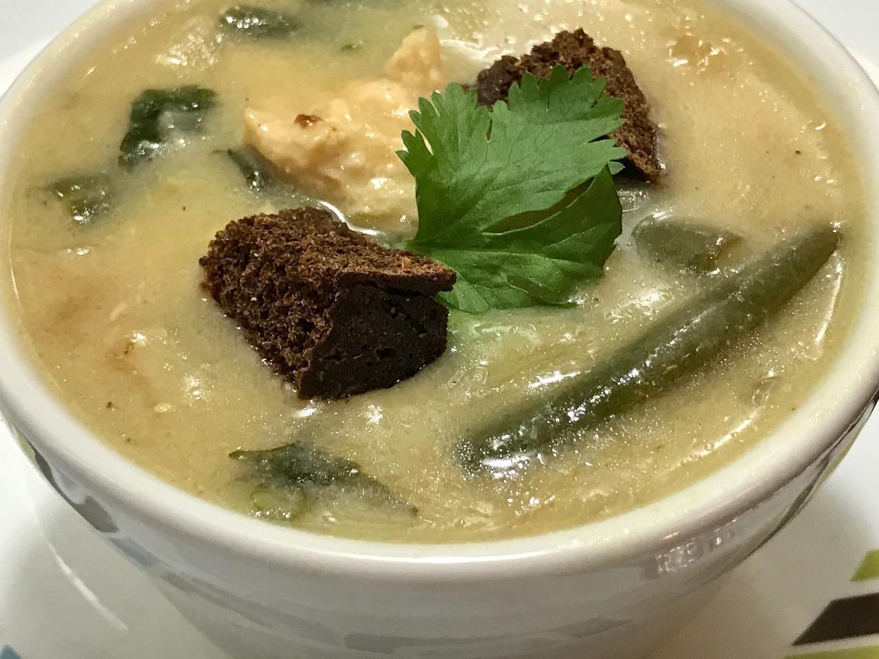 Delight Soy chicken nuggets transform into plump pieces of delight when cooked in this velvety rich faux chicken soup. Chicken never tasted so good! Made with a rice base called RICE CREAM adds of onion cooked till sweet, fresh green beans and fresh cilantro. A little fresh grind black pepper seals this deal forever GOAT.