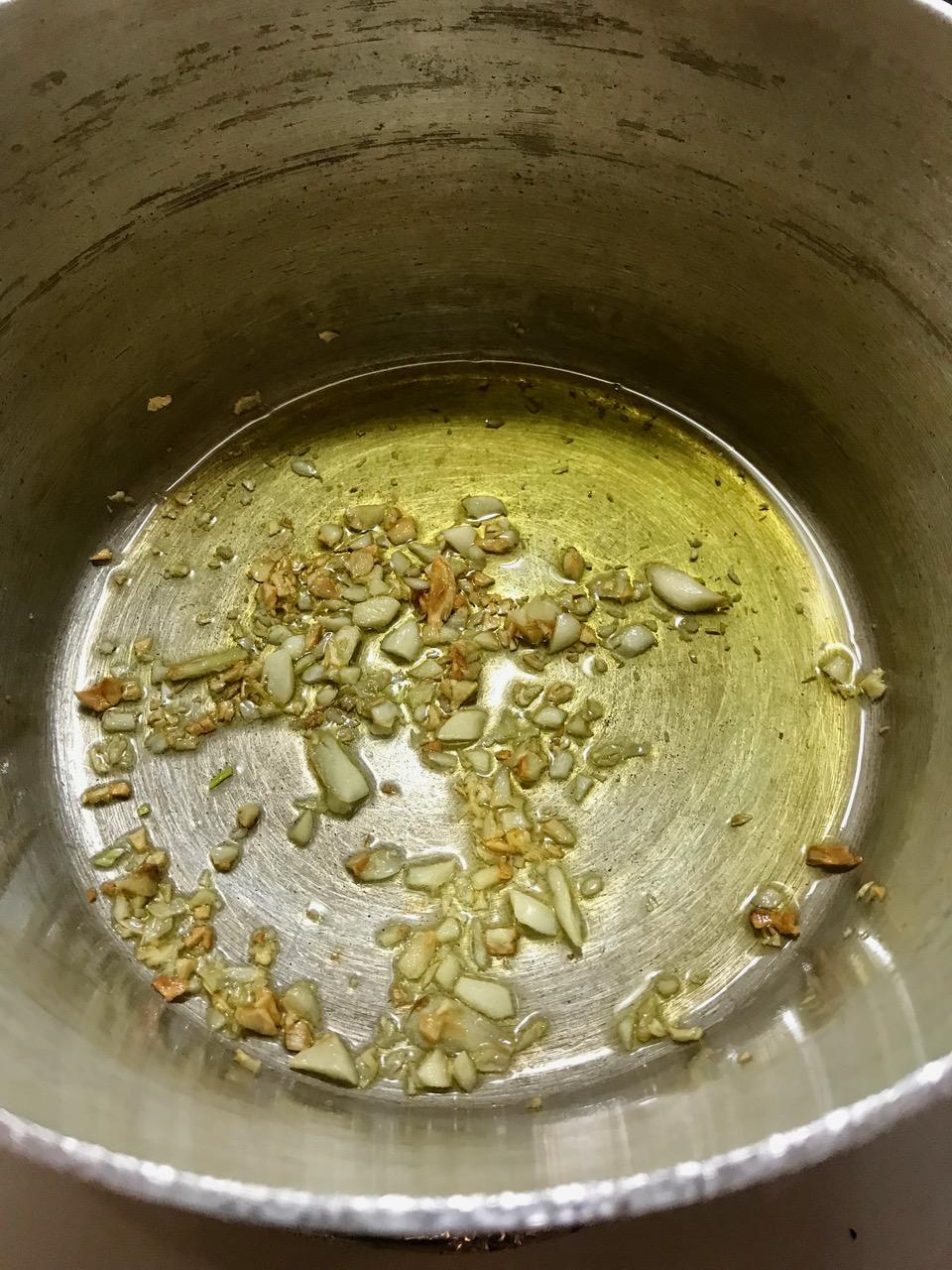 1- In extra-large saucepan over low heat melt oil and add garlic. Swish around till lightly golden. Salt a bit and remove from burner.