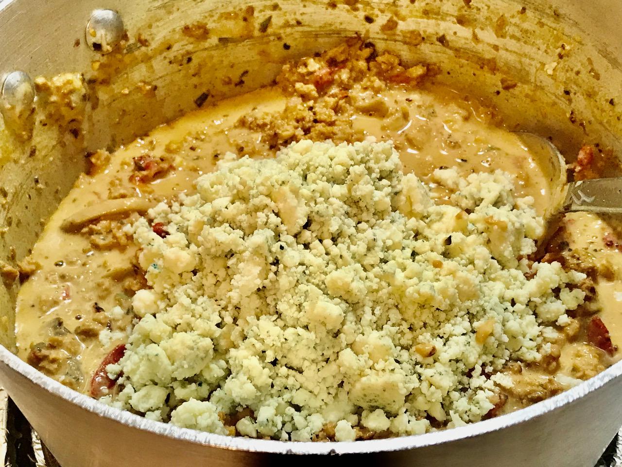 6- Add remaining ingredients, except BLEU cheese, pasta and fresh basil, stirring after each addition.