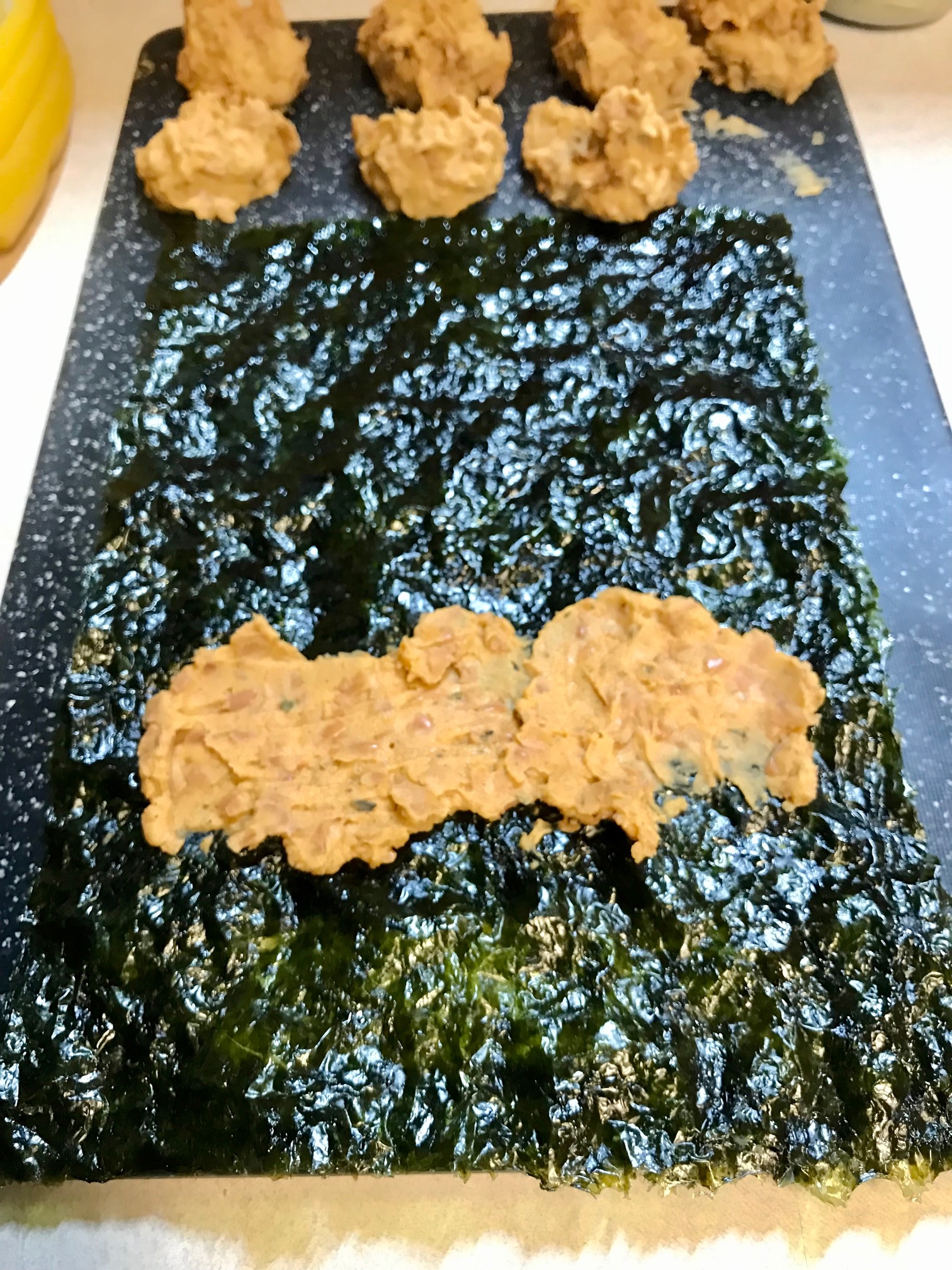 2- Spread 1/8th bean paste across sheet about 1/4 down from bottom closest to you.