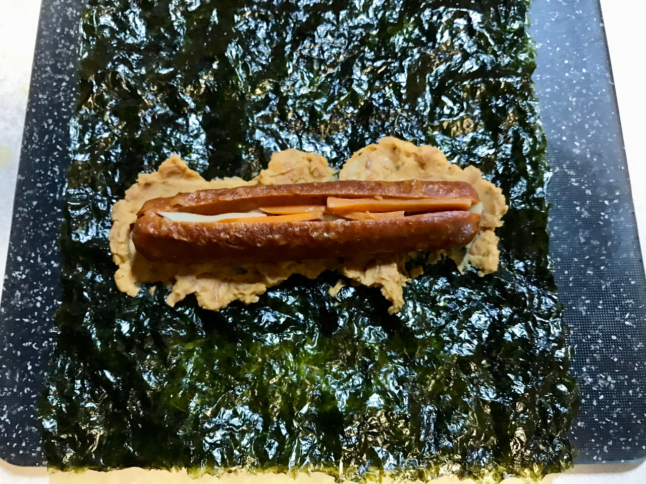 3- Lay a stuffed hot dog on top of and horizontally across the paste.