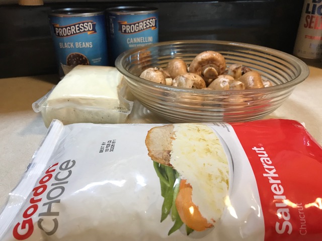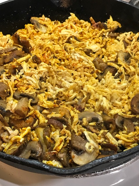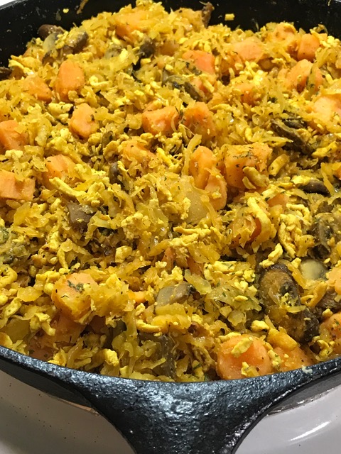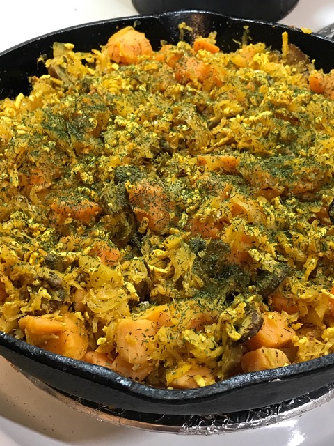 Pan-fried mushrooms, shredded vacuum packed tofu and canned yams mixed with squeezed sauerkraut. Added herbs and spice make everything nice! Especially the chew!