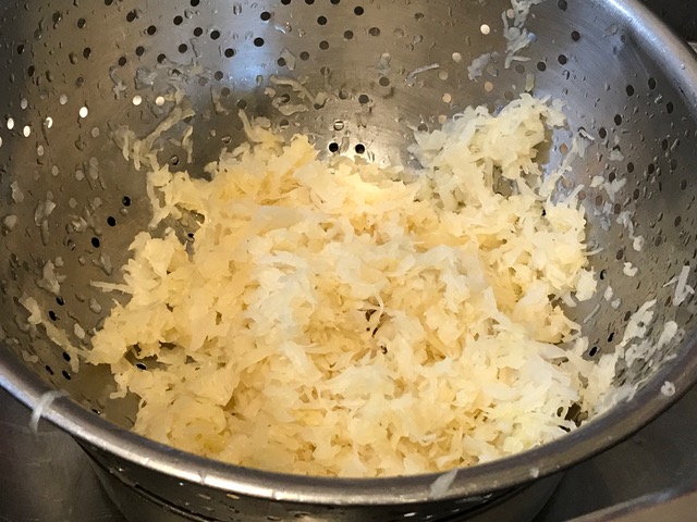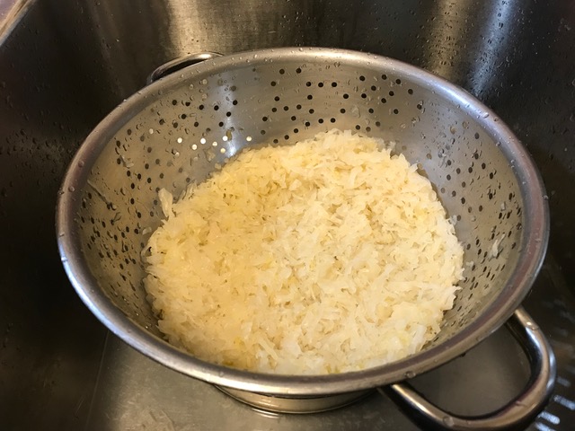 2 lb. bag sauerkraut – place in colander, rinse under cold water to remove excess vinegar, then using fits press against bottom and sides to extract and discard liquid, then squeeze in hands to extract more, set aside