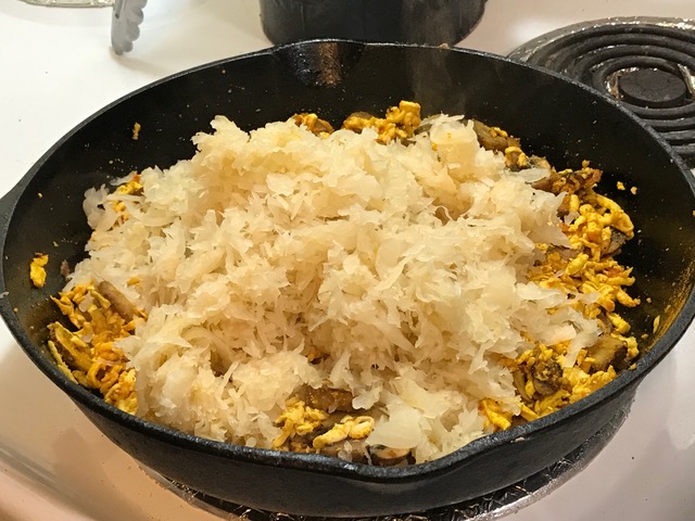 4- Spread sauerkraut evenly over tofu mix, add more salt, then lift and flip, waiting for bottom to cook 3-5 minutes each time.