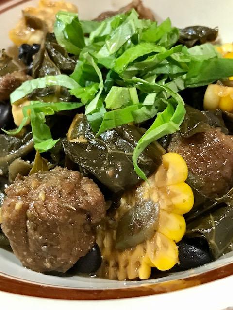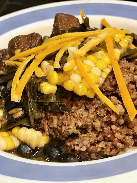 6- Spoon rice into individual serving bowls. Top with the beef, collards, corn and bean mixture including some broth/marinade.