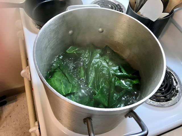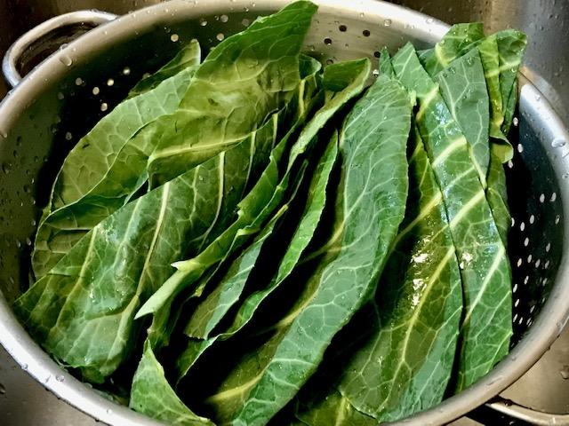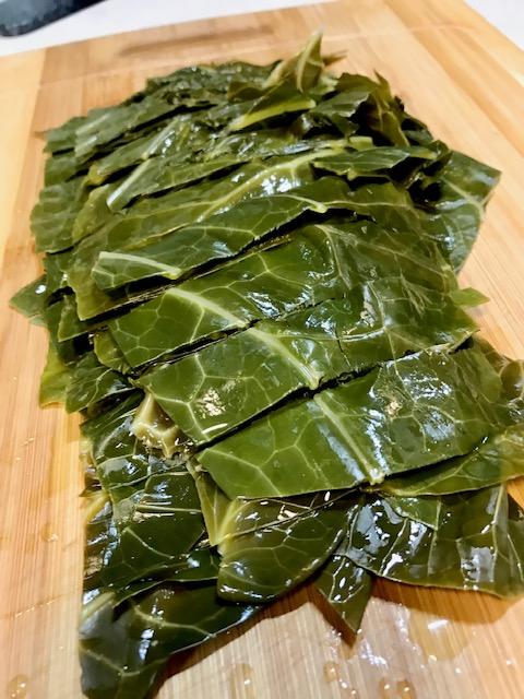 1 bunch fresh collard greens, wash well, trim edges of any brown spots, then cut out main vein of each collard and discard; boil a pot of water, cook collards about 10 minutes or till tooth-tender, drain, rinse under cold water, lay each leaf out flat, stack and cut crosswise into 1 inch wide strips – set aside