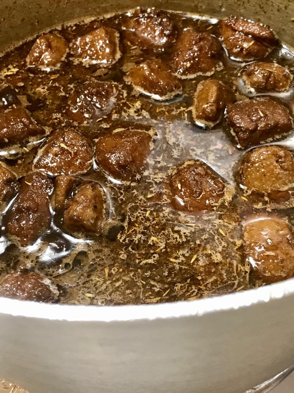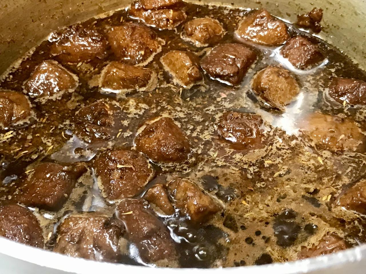 1- Place all marinade ingredients plus BEEFLESS TIPS in large saucepan. Let set for a couple hours with no heat.
