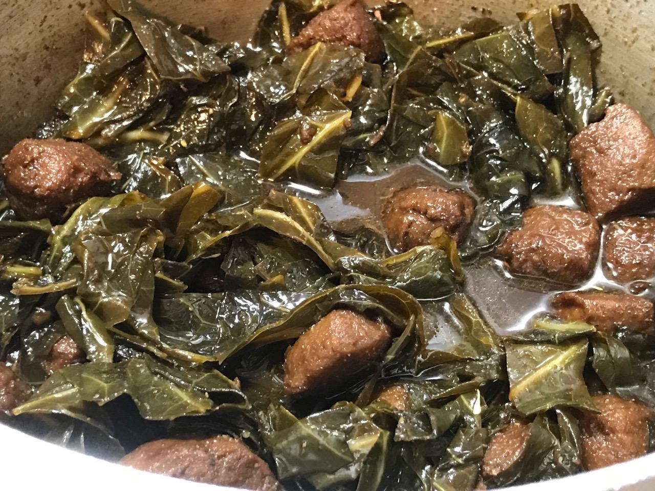 1- In large pot combine beefless tips including the marinade and cooked collards. Stir to submerge the collards, then cook till hot and bubbly. Don’t overcook.