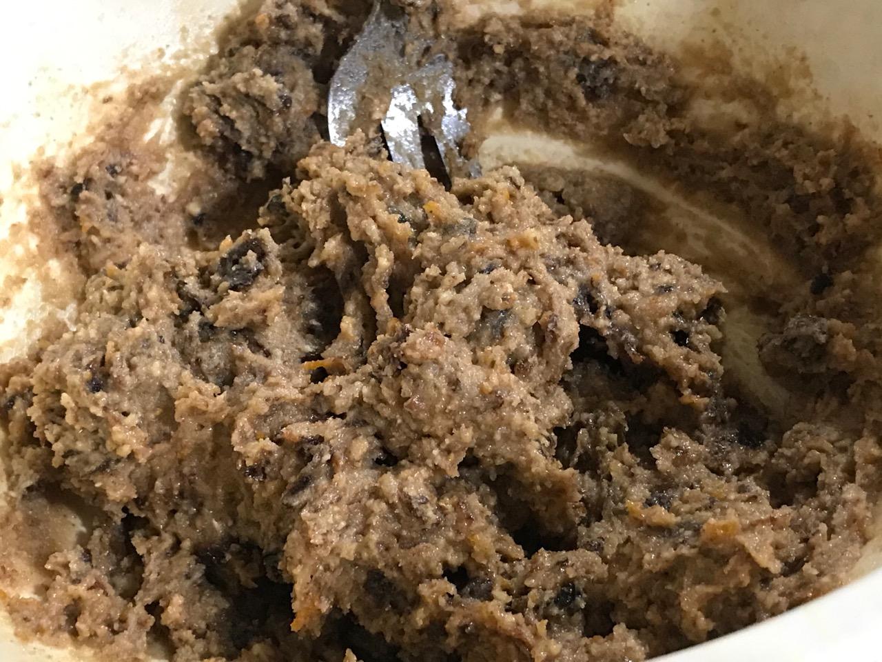 1 c. dried prunes, finely chopped on a board (it doesn’t take long); if you use a processor some large pieces will remain while the rest turns to paste