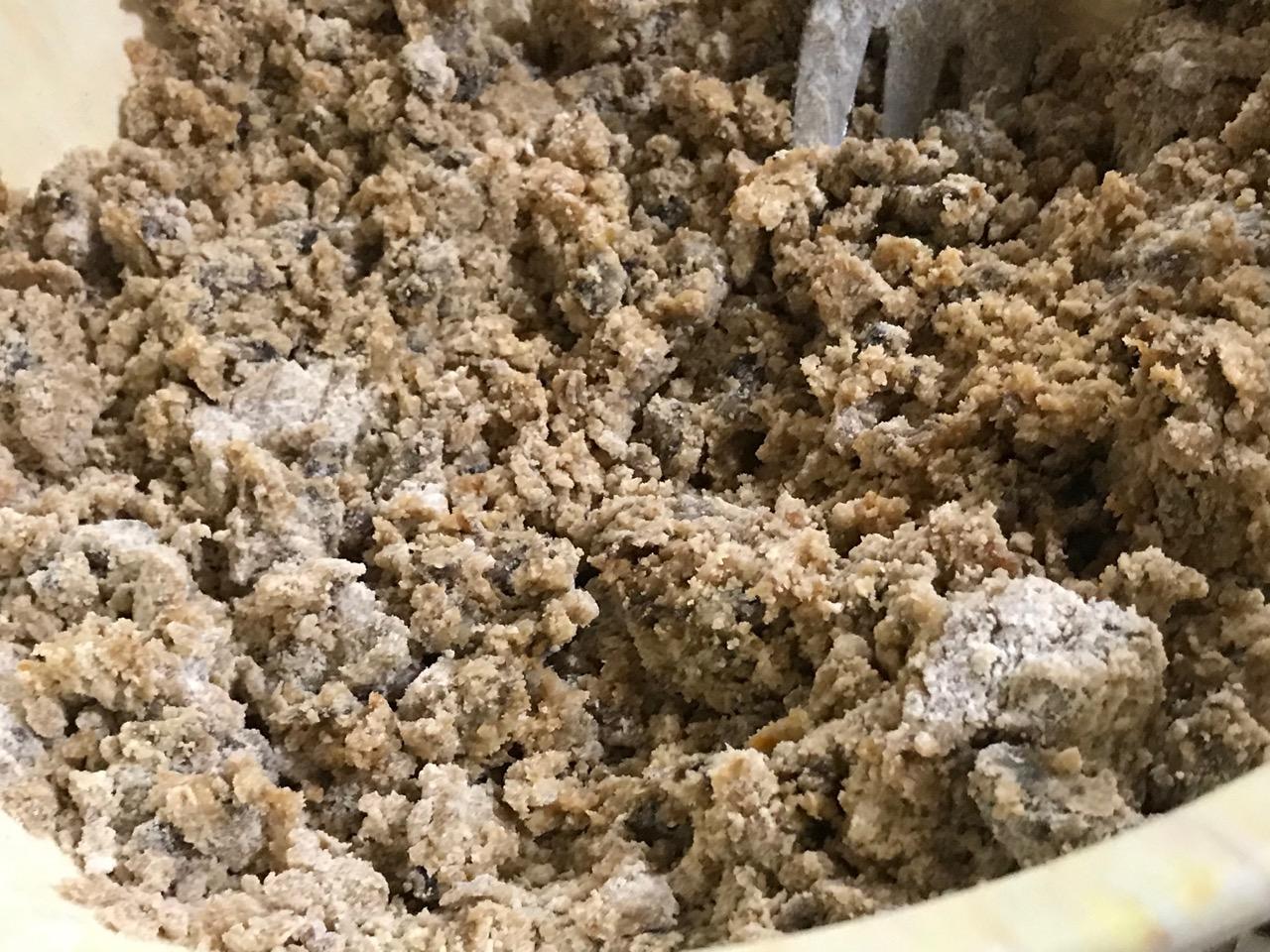 8- Now stir the flour mix into the butter/sugar batter, using clean hands if necessary.