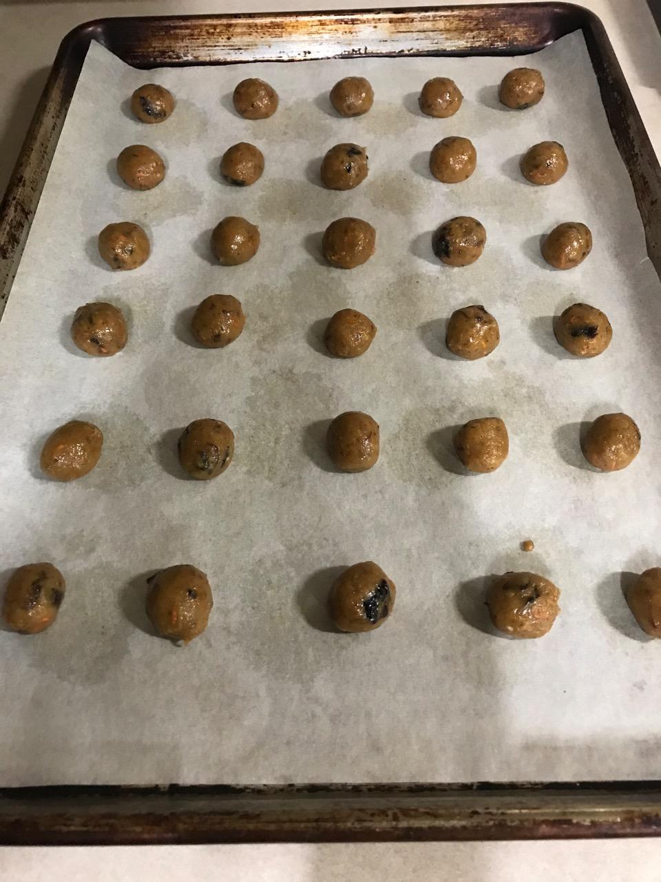 10- Drop by teaspoonful onto greased baking sheets or parchment paper lined baking sheets about 2 inches apart. Or pinch off the same amount of dough and roll it into a marble-size ball. Or do both as I did.