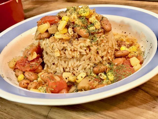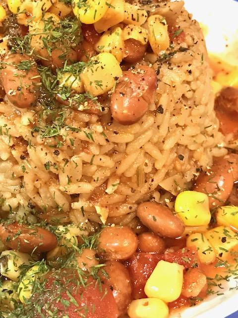 This day I topped mine with a veggie mix Steve made the day before: Sauteed mushrooms and onion with canned pinto beans, corn and diced tomatoes (drained), seasoned with garlic, basil, liquid smoke, salt and fresh grind black pepper. Then garnished with dried dill weed