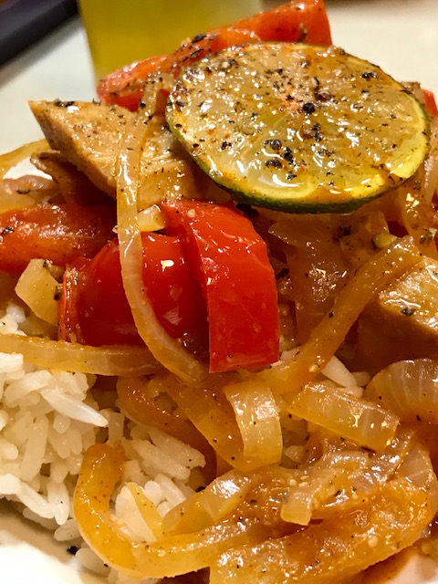 1 lg. sweet onion – cut ends off, cut in half from end to end, then cut into thin half rings, 1/4 inch wide