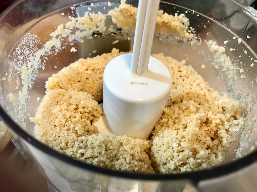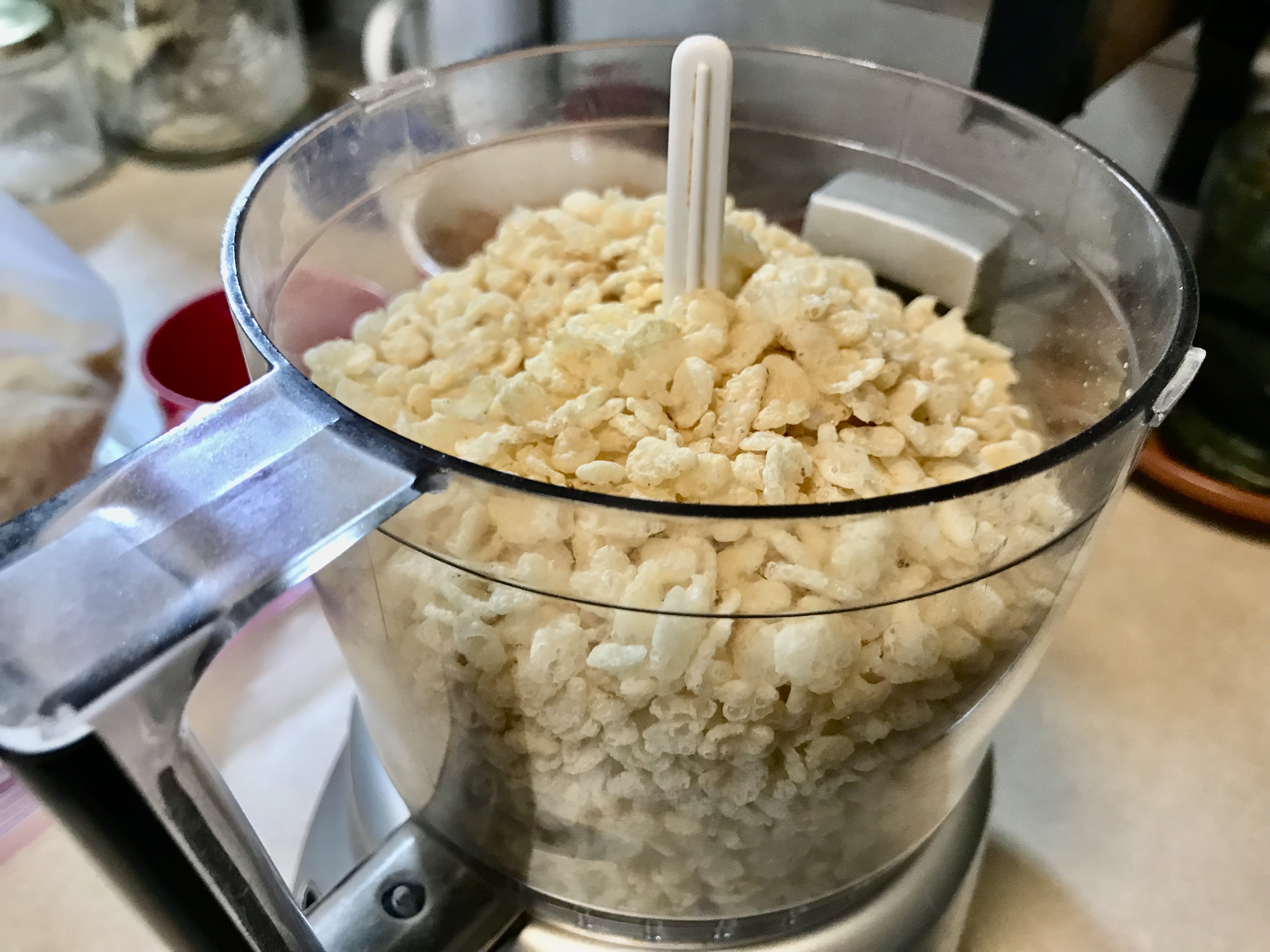 Unlike loose breadcrumbs, these ricecrumbs are more dense and ball up when processed with oil and garlic – a different but impressive texture change!