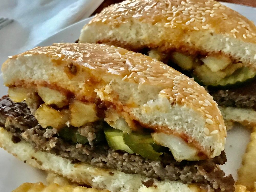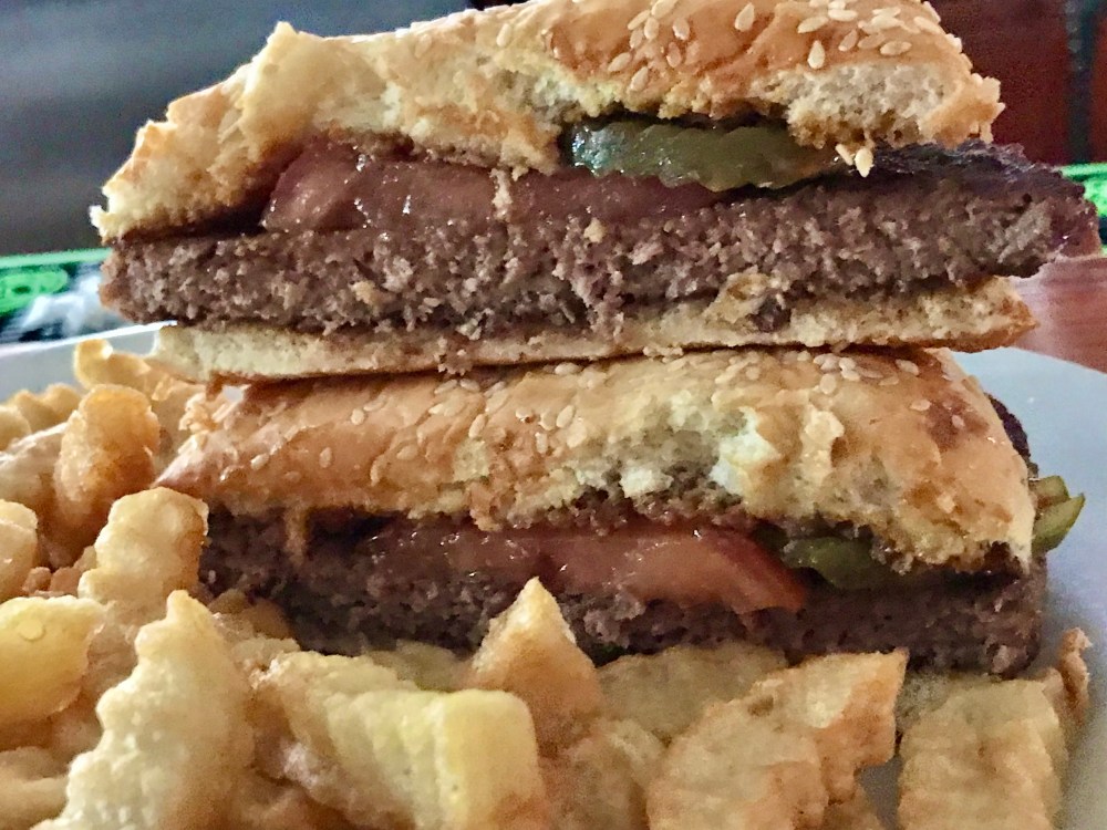The second time, I used the same ketchup and Daniel’s sauce combo, plus pickle slices, plus I stacked a few french fries on top and ate it that way. It’s a super large burger, and I could hardly finish it, but I did – with no regrets!