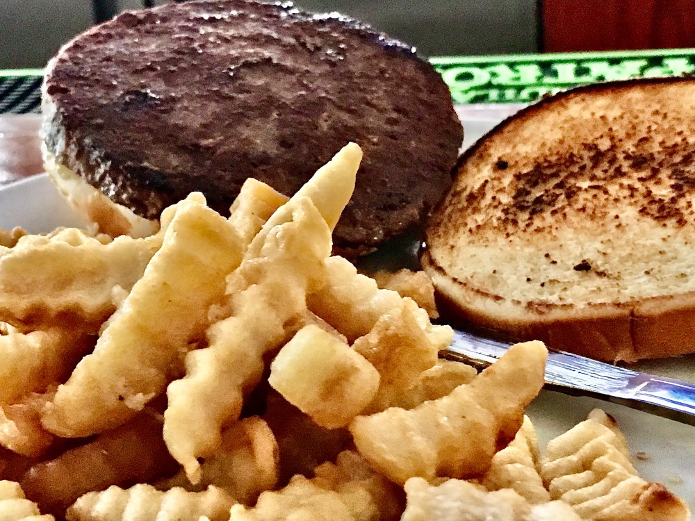 So the first time I had this Impossible burger at Tick Tock I ordered it without the lettuce and onion, no cheese. Then I spread ketchup and Jack Daniel’s sauce on the bun – the Daniel’s sauce cost extra, but it’s that good, so I pay a little more.