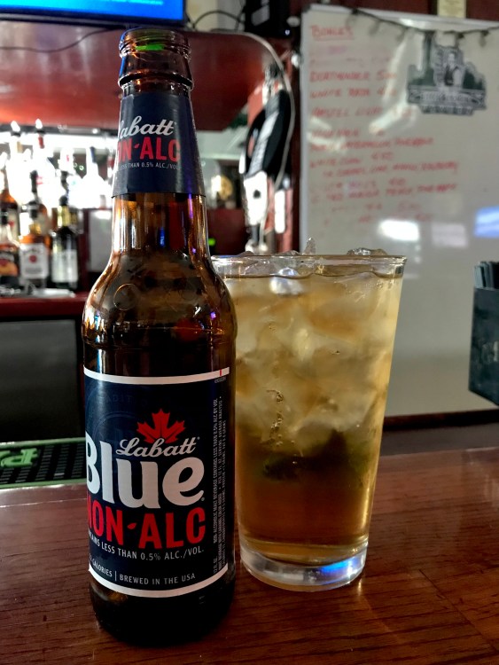 Labatt Blue has a new alcohol-free beer called Blue NON-ALC, which is a good brew with a good name and mighty tasty with this Impossible Burger.