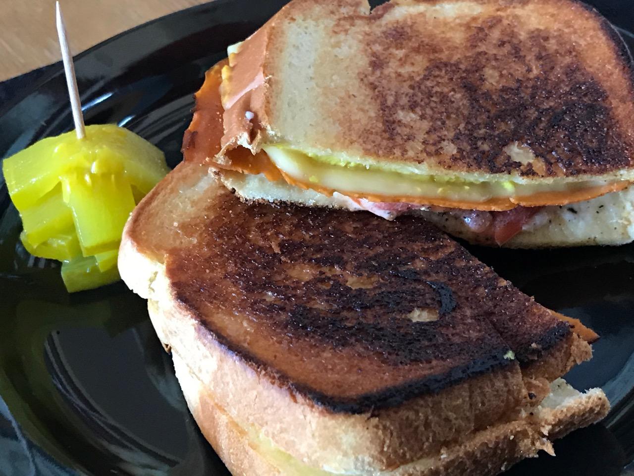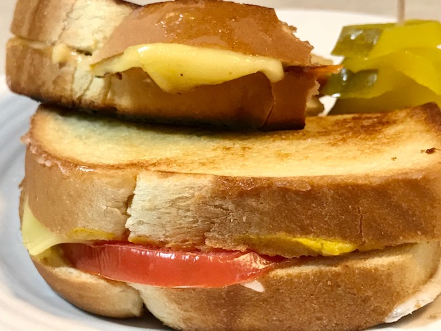 Spread mustard thinly on one bread and mayo on the other bread. I used 2 plant-based smoked gouda slices, a slice of lightly pan-fried animal-free bologna and fresh, slice tomato heated in the fry pan and removed immediately to keep its shape; fresh grind pepper the tomato slice.