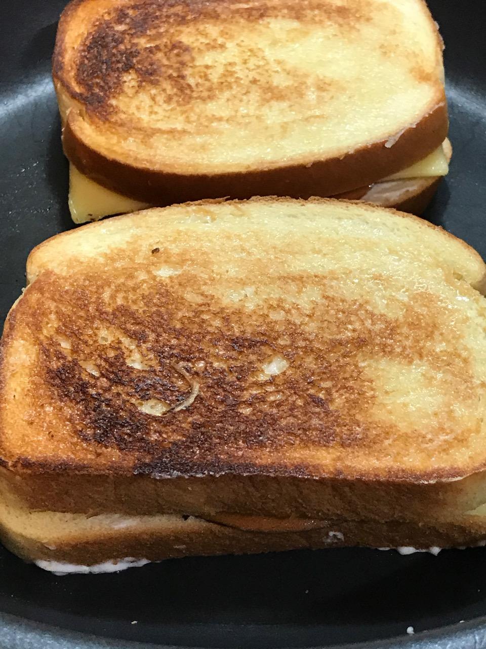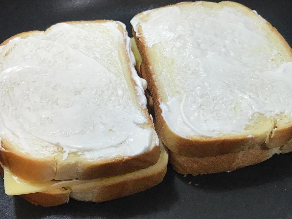 Close sandwich, smear top evenly with mayo, cook on mayo side down slowly, evenly to soften cheese. When golden to your likes on the bottom, smear top with mayo, then turn over and cook that side till golden and/or charred as you like.