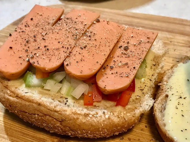 2- Bring saucepan of water to boil. Add 3 veggie dogs and cook till heated through – not too long otherwise they’ll get mushy. Remove to board. Cut each V. dog in half around the equator, then slice each segment in half from end to end.