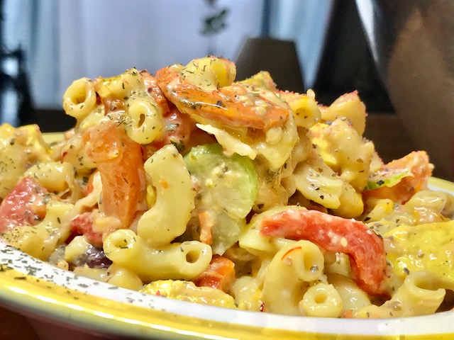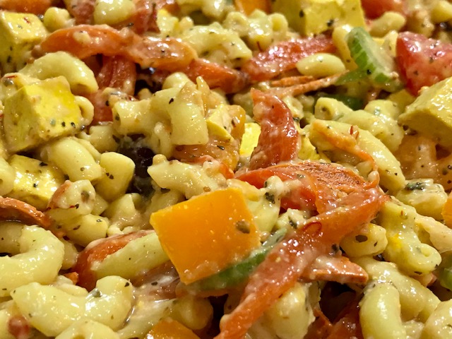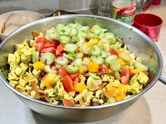 Elbows cooked rice-style combined with seasoned, cooked tofu cubes with Kalamata olive, plant pepperoni, roasted peppers plus the fresh of celery, tomato and snowy onion. Seasoned with basil, tarragon, garlic and tossed with a multi-condiment dressing! I added some crushed saffron threads to mine, but it by no means requires it!