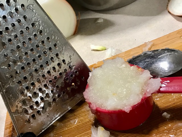 1/3 c. snowy sweet onion – fresh onion grated over hand held grater into snow – discard large pieces
