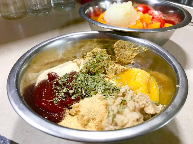 5- Now add the dressing all at once, or as much or as little as you want, using clean or gloved hands if you want faster results, being sure to coat all ingredients.