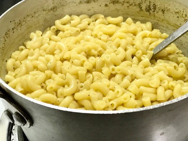 1- In super large bowl or clean, dry pot, place drained macaroni. Taste for salt – now is the time to add salt if needed for the pasta – it always needs some.