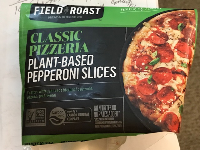 5 oz. pkg. FIELD ROAST brand pepperoni, thawed, stacked and cut into sticks