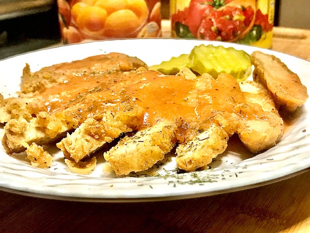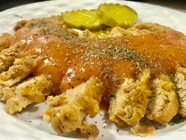 Notes: Those CRAZY CRISPY CHICK’N BREASTS are more reminiscent of southern fried than not. This time I air-fried them according to instructions, 11-13 minutes in a basket, or till tender as you like.