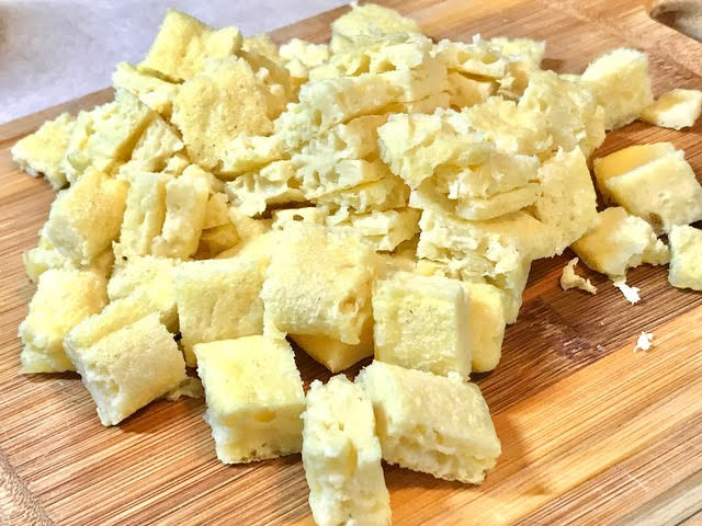 Then we cut it into 1/2 inch cubes, no larger.