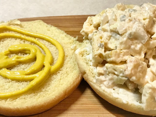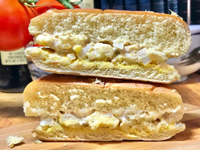 Mound egg salad on the mayo half, close, cut and serve.