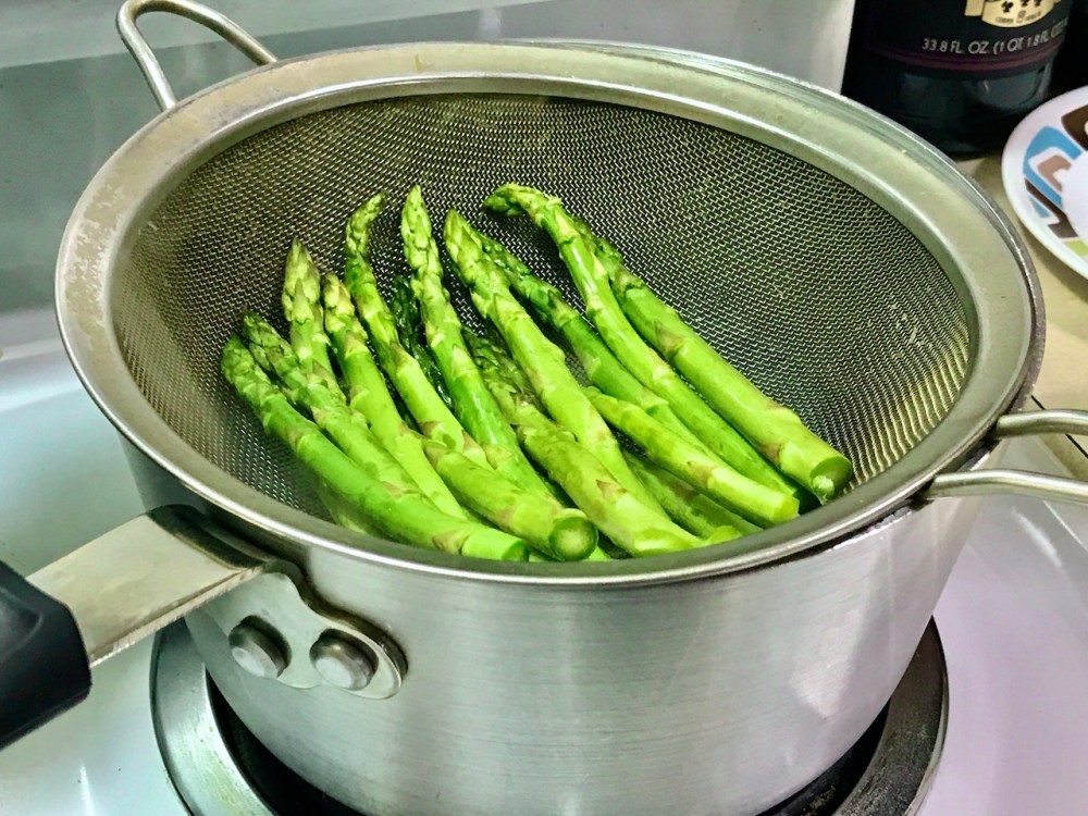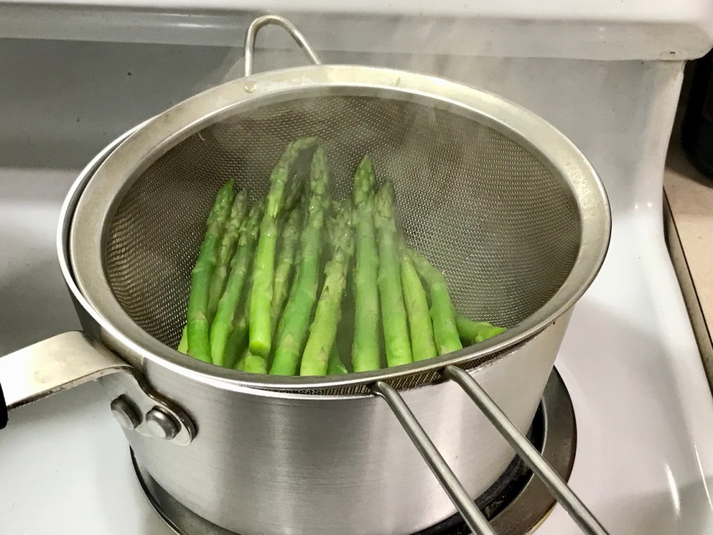 Bring a couple inches of water to boil in saucepan. Place a wire mesh strainer over pot, add the aspargus to the strainer, cover and steam till done as tender as you like.