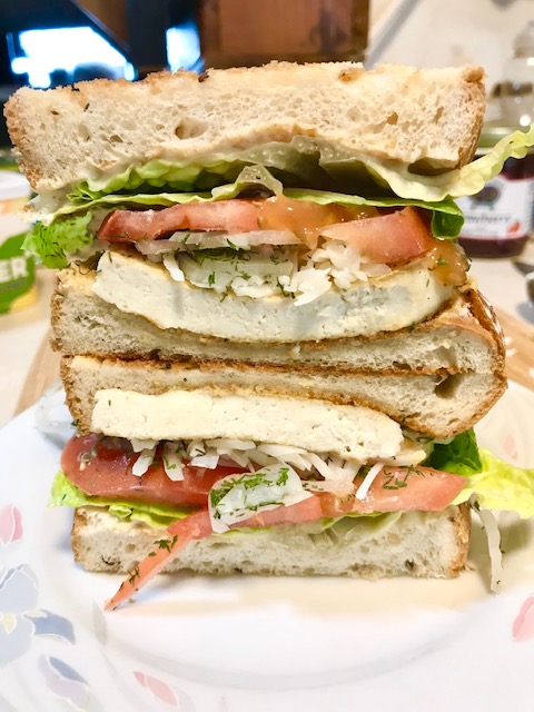 High protein tofu planks pan-fried and seasoned. Served on thick, whole grain deli bread, spread with mustard-mayo mix to taste, piled with green leaf lettuce, fresh cut ripe tomato, shaved sweet onion. You can't beat the fresh taste of a simple fresh veg sandwich. Add a high quality seasoned protein source and you double theContinue reading "High Protein Tofu Sandwich – summer is in the house!"
